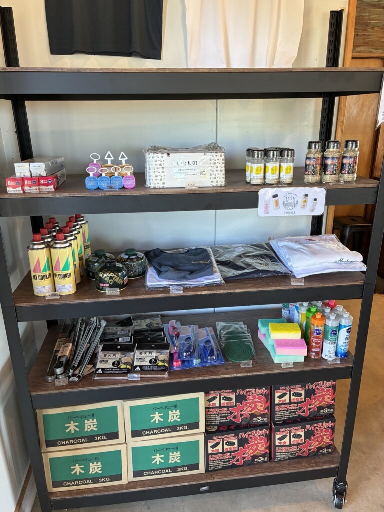ガスボンベやキッチンペーパーなど必要なものは最低限揃っています。炭は800円で販売されていますが、唐津市街のホームセンターで同じ商品を600円弱で買えました。
