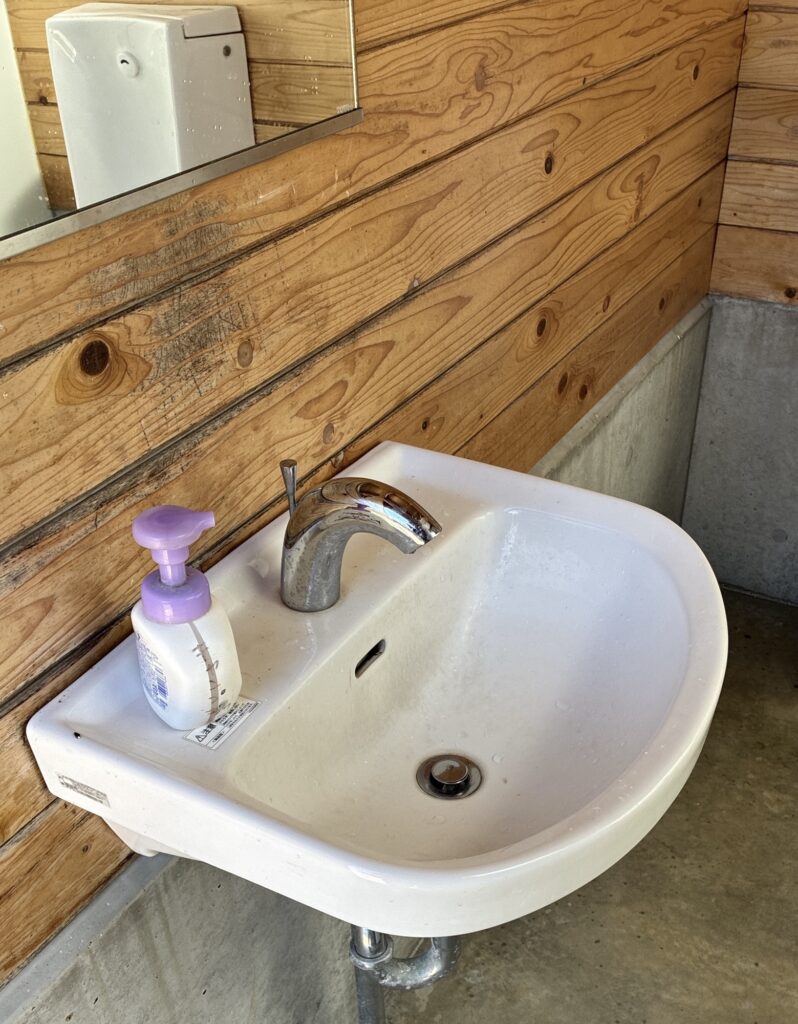 フリーサイト側には、炊事場が1ヶ所あります。蛇口が10個ほどありますので混むことはほとんどないと思います。灰捨て場と、焚き火台などを洗う低めの蛇口がありますので、嵩張るようなギアや泥で汚れたものも洗えそうです。炊事場の写真は撮り損ねました、、、スミマセン。