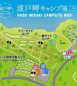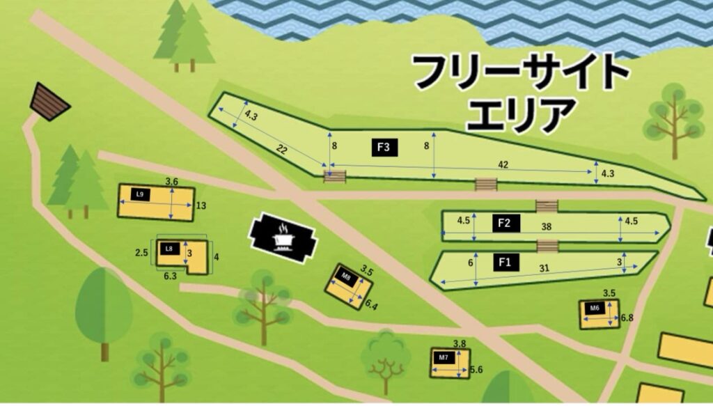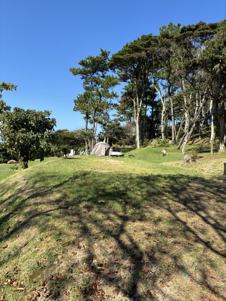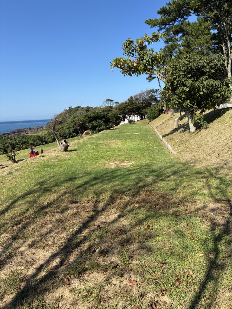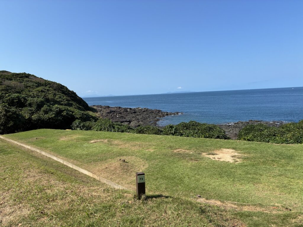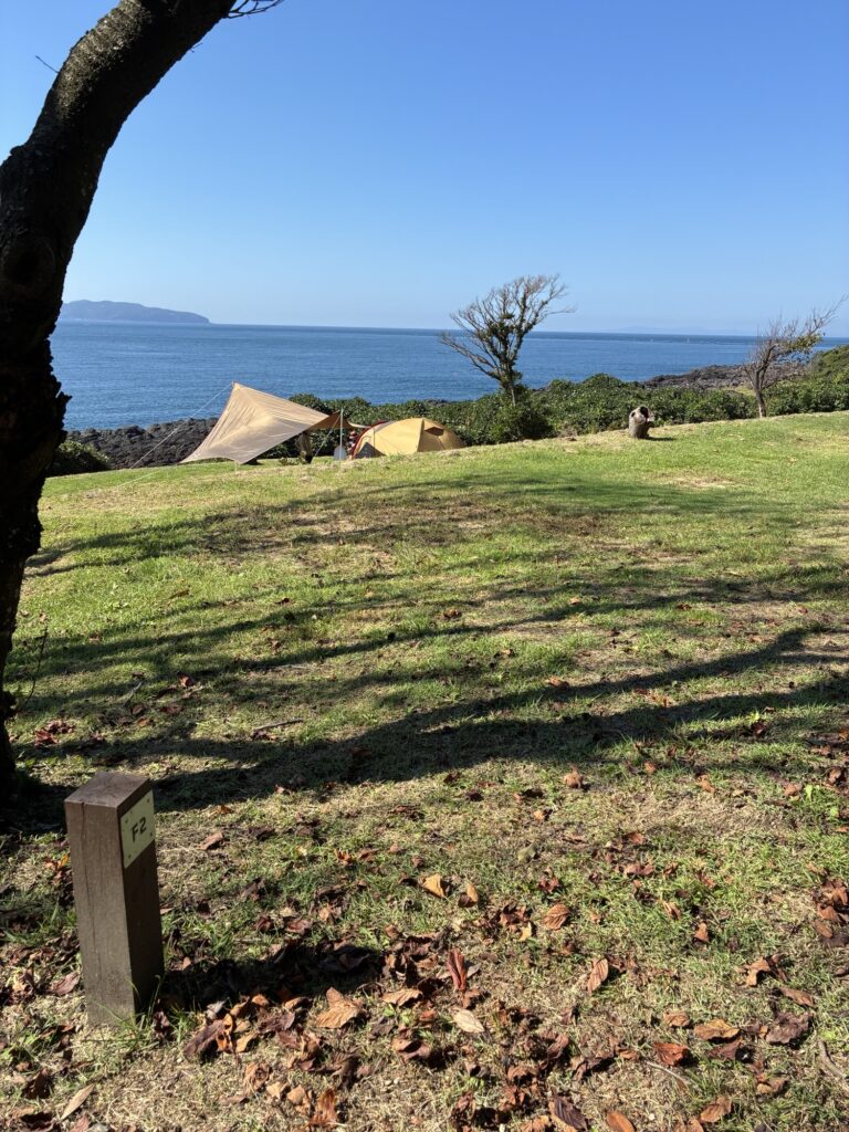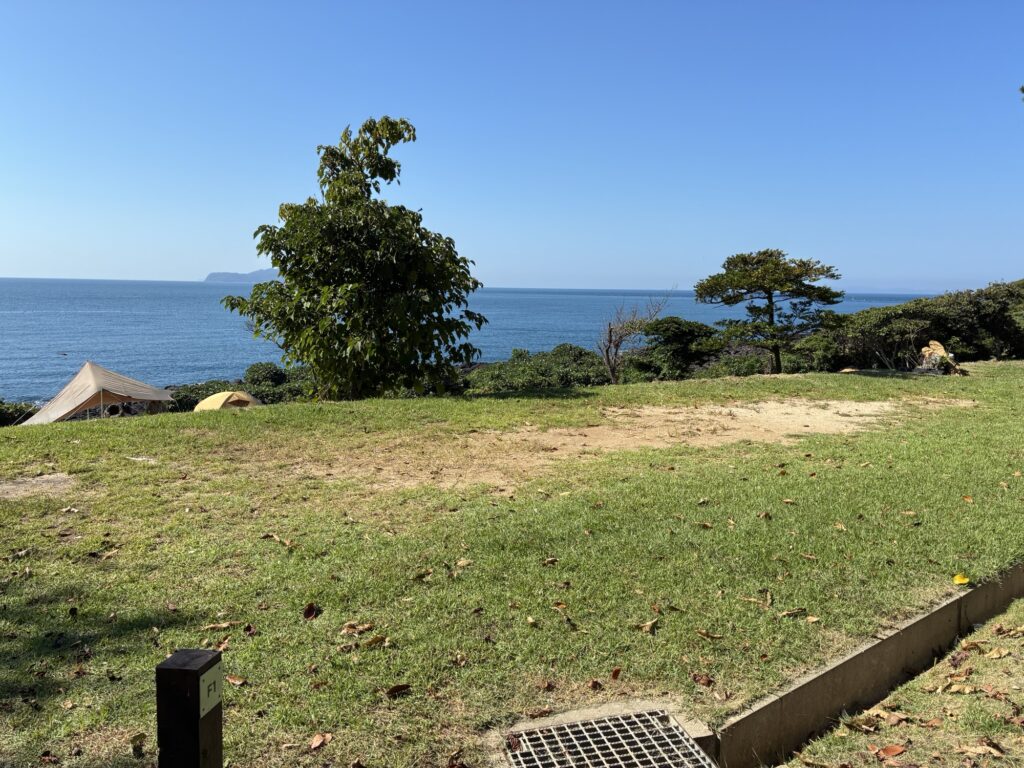 フリーサイトはF1〜F3で構成されています。F1、F2、F3の順に高い位置にあり、上に行くほど眺めは良いですが、人工物(テント、人等)、林内に入ると木々などを挟むので気になる方はF3が良いかもしれません。F3は最も低い位置にあるものの、目の前が海ですので、人工物を挟むことなく景色を楽しむことができます。