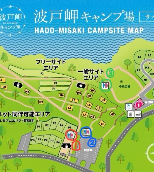 フリーサイトエリアから近いトイレは、下の写真のように主に①ペット可能同伴エリア内②駐車場内③中央広場横の3ヶ所です。