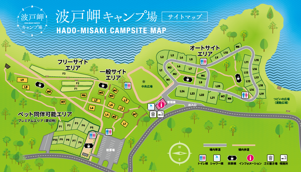 車を横付けできる「オートサイト」、車は駐車場に停めてリヤカーなどで搬入する「一般サイト」「フリーサイト」があります。一般サイトは区画割りしており、フリーサイトに比べて高い位置にありますので、全体を見渡せます。フリーサイトは海に近い場所に位置しますので、特にF3では目の前の広大な海を楽しめます。